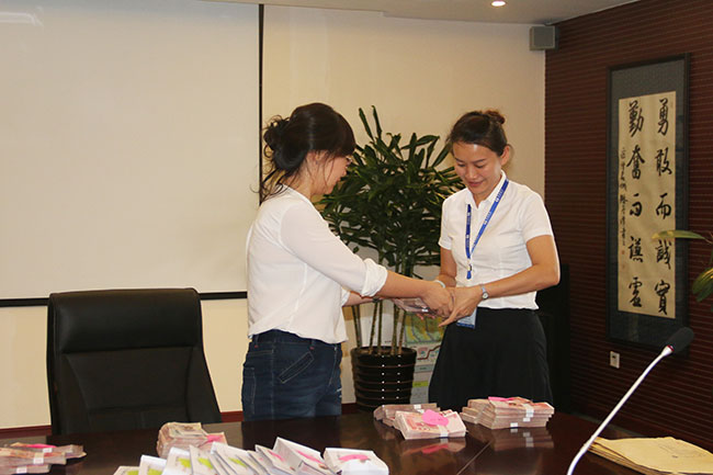 9月8日下午,經(jīng)營(yíng)中心宣布召開(kāi)銷售會(huì)議,會(huì)議由集團(tuán)常務(wù)副總經(jīng)理莫丹主持,濱江3號(hào)、溫泉小鎮(zhèn)、金海瀾山全體銷售人員參與會(huì)議,就在大家準(zhǔn)備認(rèn)真做好記錄的時(shí)候,呈現(xiàn)在大家面前的是幾十萬(wàn)元的現(xiàn)金。