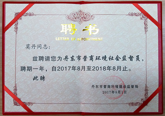 根據(jù)市營(yíng)商環(huán)境建設(shè)監(jiān)督局發(fā)布消息,遼寧金海集團(tuán)總經(jīng)理莫丹被正式聘請(qǐng)為丹東市營(yíng)商環(huán)境社會(huì)監(jiān)督員。