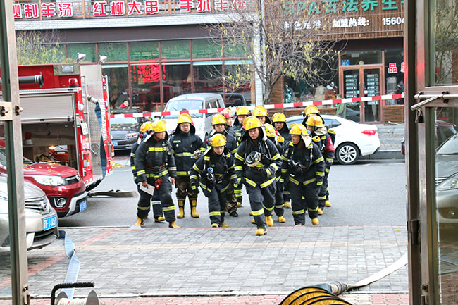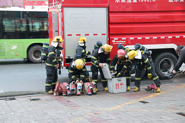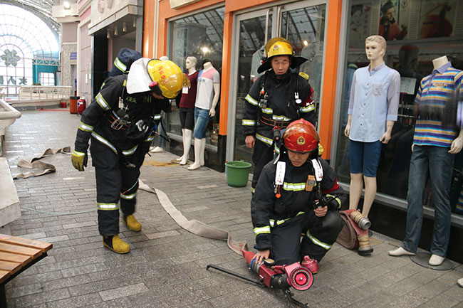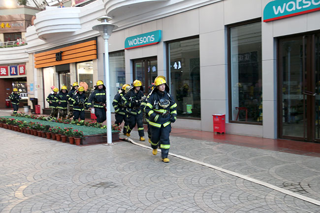 本次演練消防隊(duì)出動四個中隊(duì)50名消防官兵參加,分別通過女人街東、西門進(jìn)入商場,在商場一二樓中央舞臺區(qū)域出動消防車供水滅火管道4條、消防水炮4個、消防水槍4只進(jìn)行火場撲救,另準(zhǔn)備應(yīng)急排煙設(shè)備、強(qiáng)拆設(shè)備、應(yīng)急人員救援設(shè)備。
