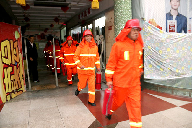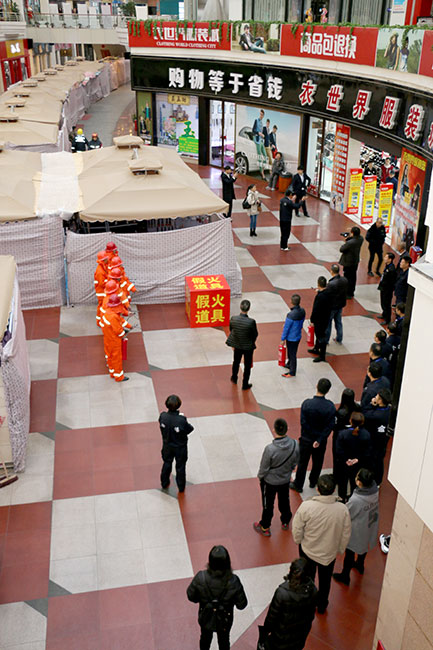 演練6.30分在女人街商場中央舞臺區(qū)域正式開始,演練分為:火災(zāi)發(fā)生第一時間現(xiàn)場人員用滅火器進(jìn)行滅火及火災(zāi)報警、商場疏散引導(dǎo)組組織人員進(jìn)行疏散、微型消防站人員進(jìn)行二次火災(zāi)現(xiàn)場滅火、消防控制室人員利用消防廣播及聲光報警器組織人員疏散、通訊聯(lián)絡(luò)組聯(lián)系消防隊(duì)進(jìn)行商場火災(zāi)撲救。
