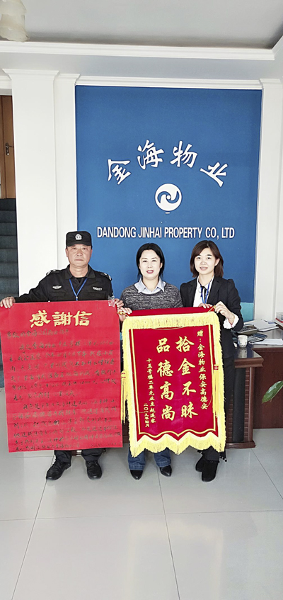 我是金海溫泉小鎮(zhèn)15號樓2單元603業(yè)主,我叫趙連榮,2019年4月7日下午,我在小區(qū)內(nèi)無意間發(fā)現(xiàn)兜里的錢包不知什么時候丟失了,里面裝有我準備買冰箱的錢,現(xiàn)金共12000元,還有銀行卡、駕駛證、工資卡、身份證等貴重物品,心里很著急,是否能找到心里確實沒底。錢包是下午四點多鐘遺失的,大概六點多鐘,小區(qū)保安高德安與我聯(lián)系,他找到了我,把錢包和證件全部交到我手上,他連錢包內(nèi)有多少錢都沒數(shù),而是通過身份證信息急于找到失主,這種拾金不昧的精神實在高尚,可敬!