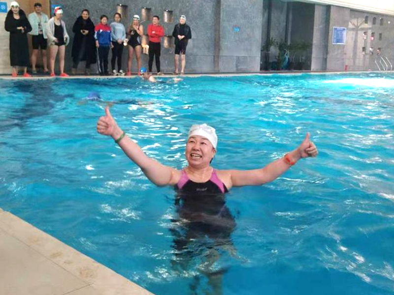 隨著一聲哨響,比賽正式開始!選手們雖然并非職業(yè)運動員,但他們各個精神飽滿,在水中劈波斬浪奮勇爭先,激烈角逐,引來了圍觀人員的陣陣喝彩和掌聲。決賽現(xiàn)場人聲鼎沸,熱情高漲。年過半百的老人們速度驚人不輸年輕與活力。最為精彩的是小選手8歲的笑笑,別看她年紀小,進入泳池像一條魚兒穿梭其中。