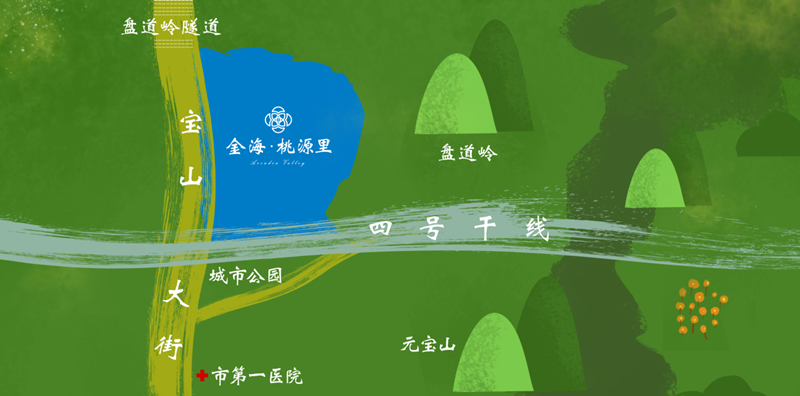 金海桃源里,位于八道溝虎躍汽車公司周邊地塊,三面環(huán)山,資源得天獨厚。